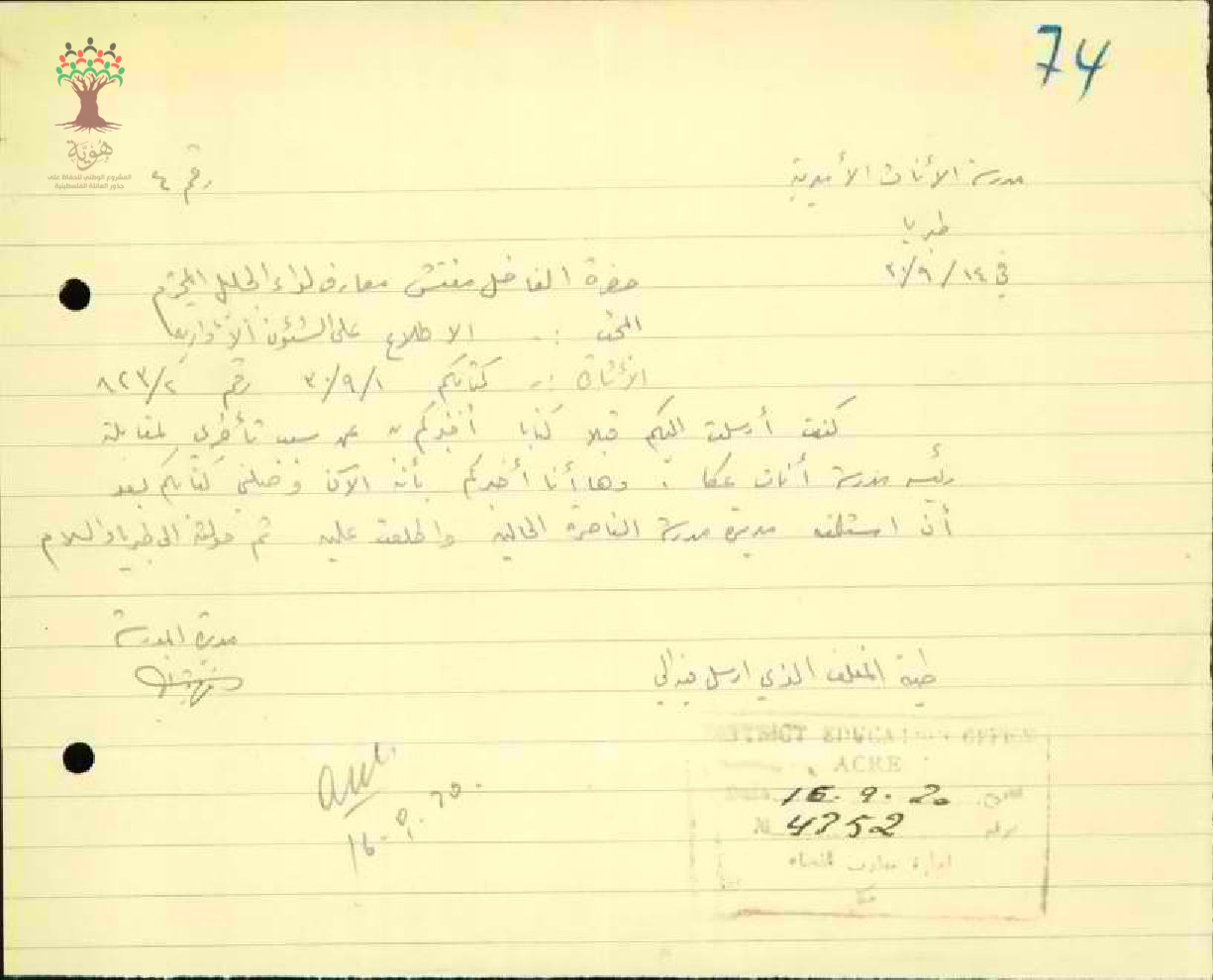 رسالة من المعلمة نهايات ايراني الى مفتش معارف الجليل ارسلت اليكم قبلا كتاب اخبركم به عن سبب تاخري لمقابلة رئيس مدرسة اناث عكا وها انا اخبركم بان الان وصلني كتابكم