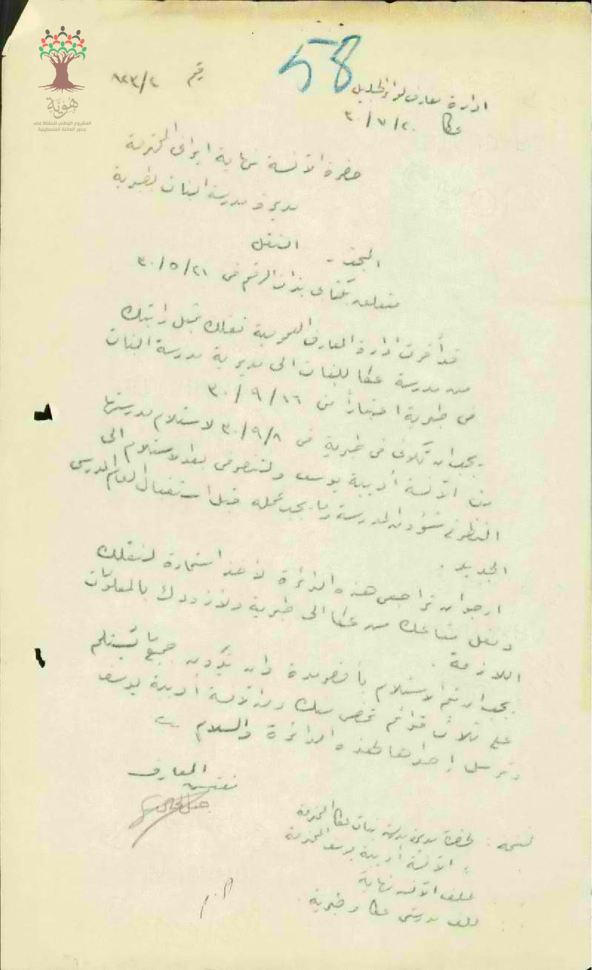 رسالة من مفتش معارف الجليل الى المعلمة نهايات قررت ادارة المعارف العمومية نقلك بذات راتبك من عكا للبنات الى مديرية مدرسة البنات في طبرية