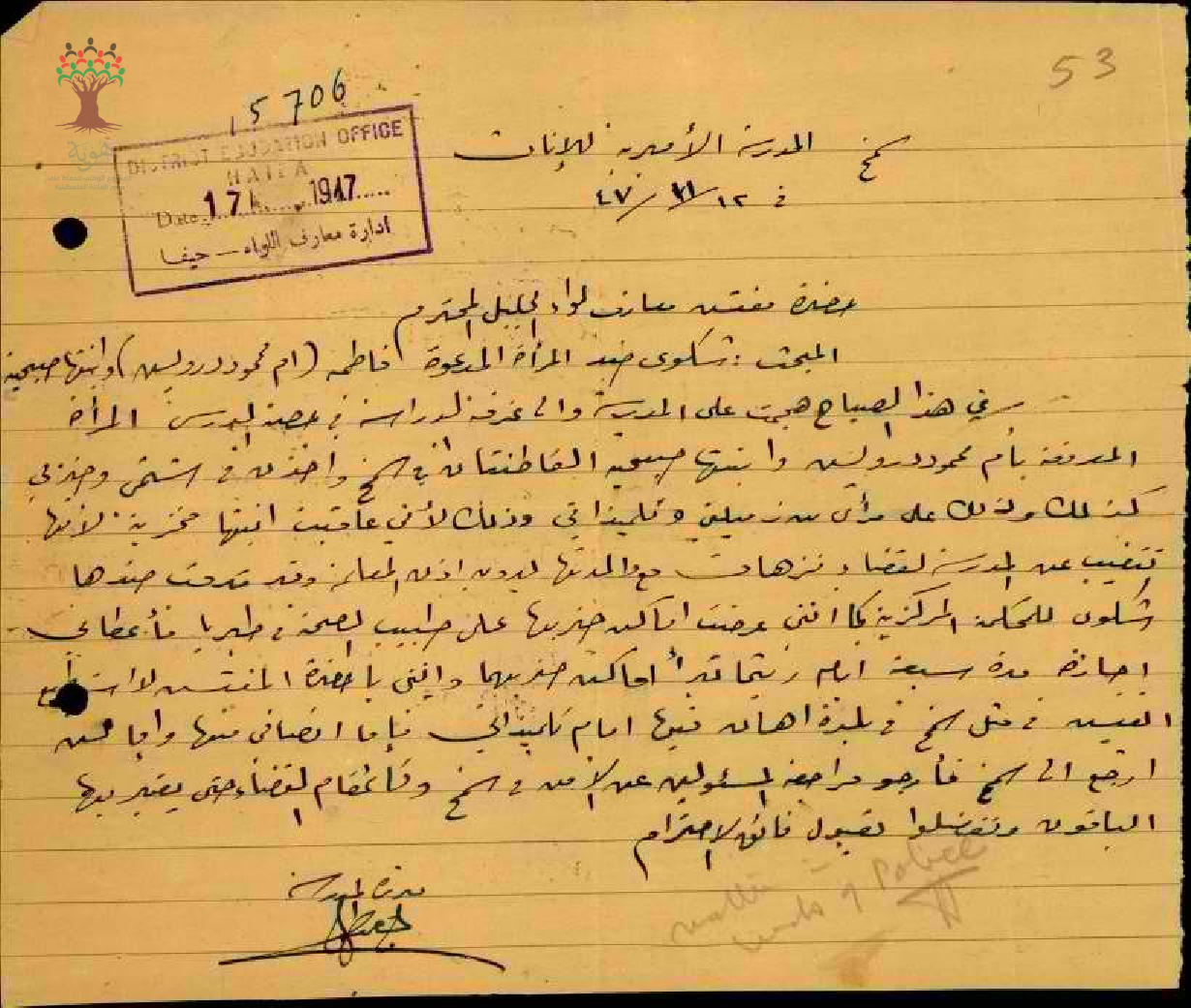 رسالة من المعلمة مريم مصطفى خميس الى مفتش معارف الجليل شكوى ضد المراة المدعوة فاطمه ام ممحمو وابنتها صبحية في هذا الصباح هجمت على المدرسة والى غرفت المدراسة في حصتي الدرسي