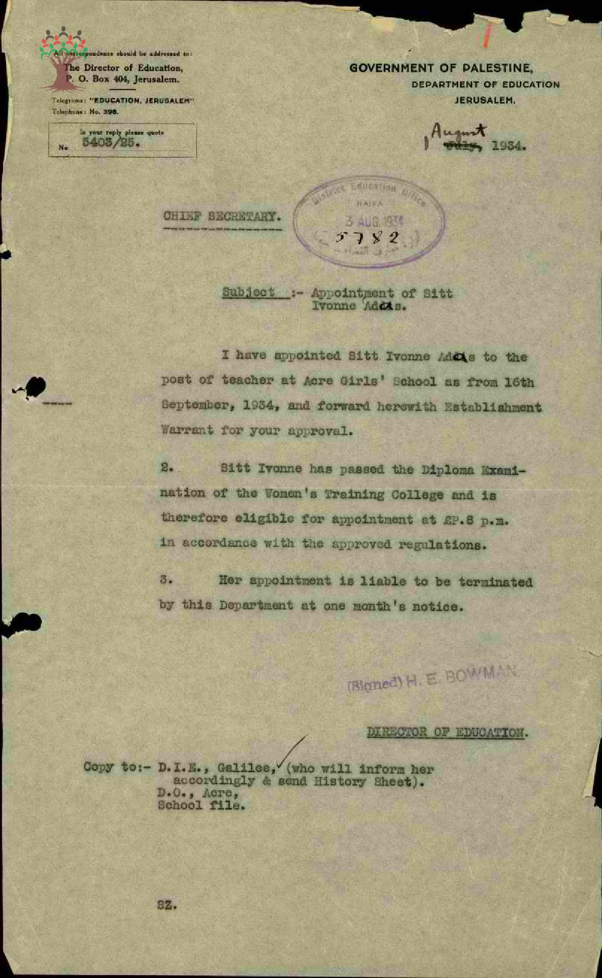 رسالة من مدير المعارف إلى السكرتير العام يبحث معه تعيين المعلمة ايفون عدس في الإدارة