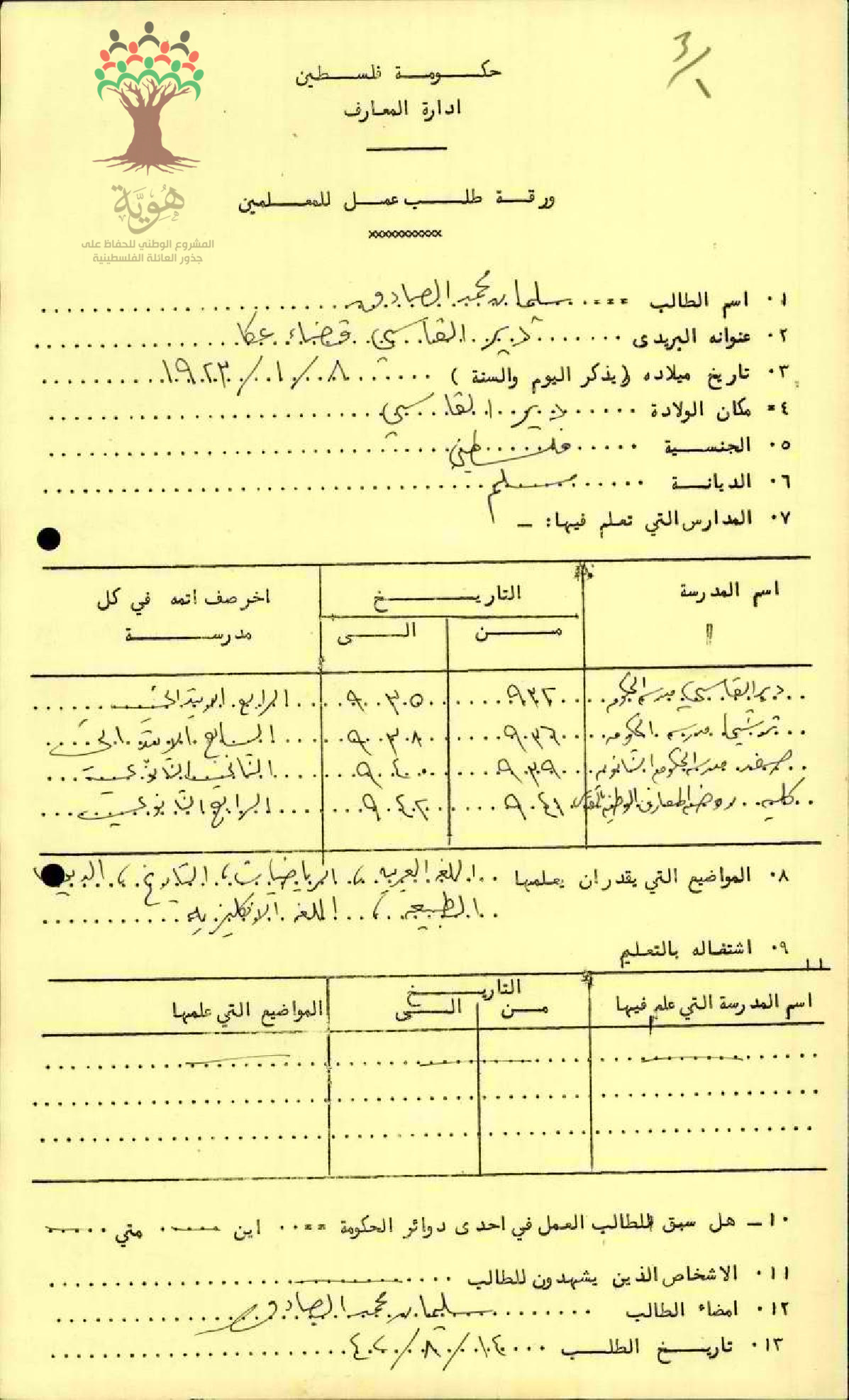 ورقة طلب عمل للمعلم سليمان محمد الصادق لدى دائرة المعارف - دير القاسي