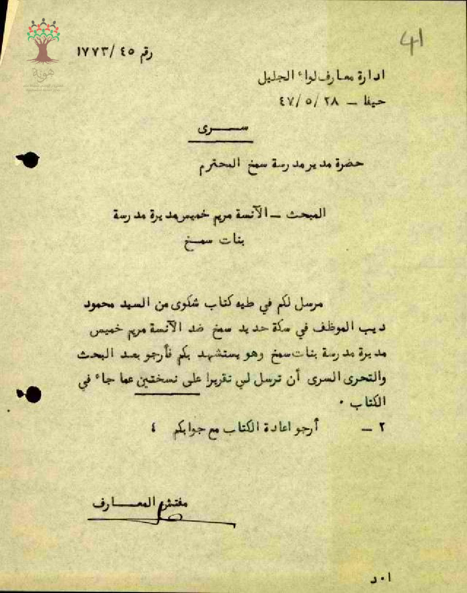 رسالة من مفتش معارف الجليل الى مدير مدرسة سمخ مرسل لكم طيه كتاب شكوى من السيد محمود ديب الموظف في سكة حديد سمخ ضد المعلمة مريم مصطفى خميس