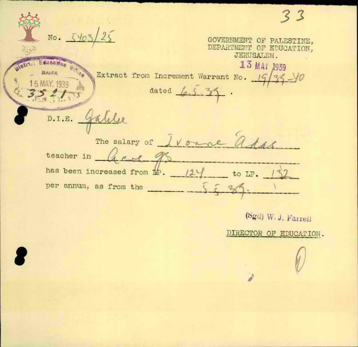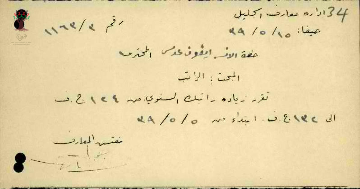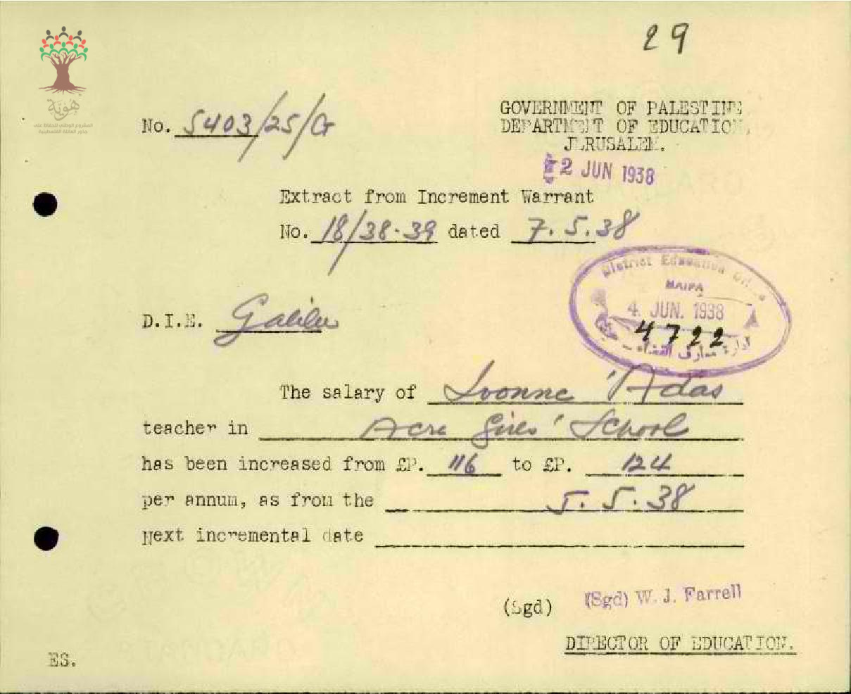 رسالة من مفتش المعارف إلى المعلمة ايفون يعلمها بقرار زيادة راتبها السنوي