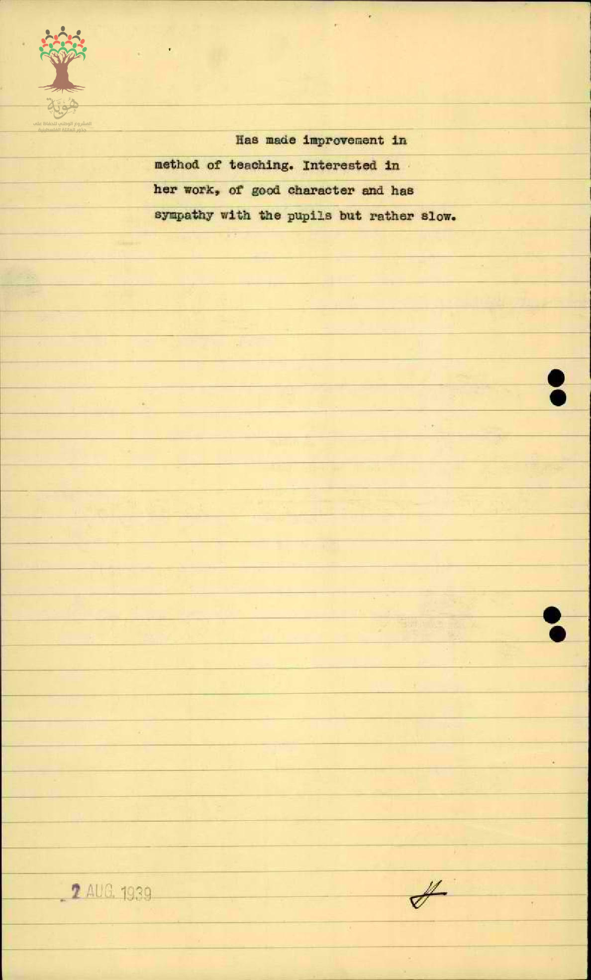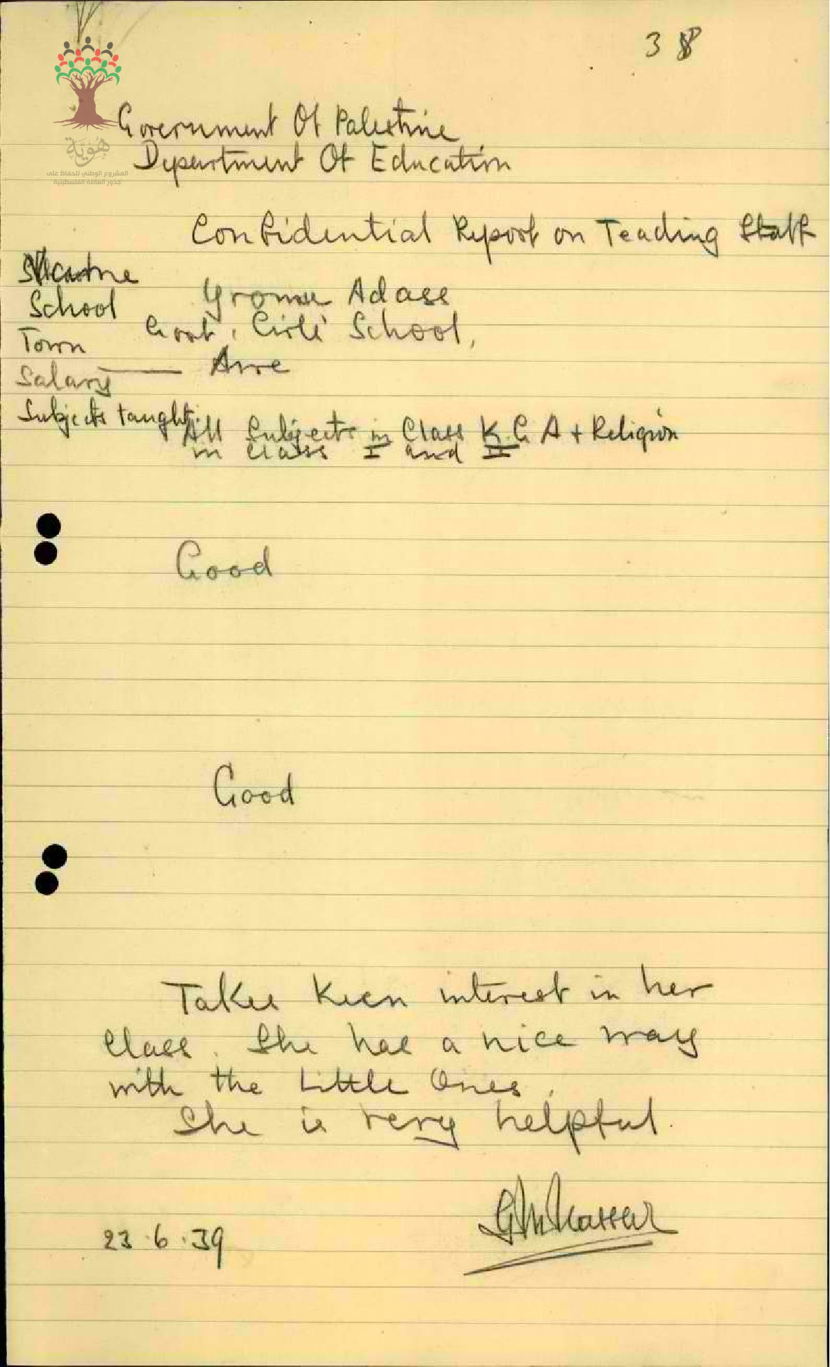 تقرير تفصيلي عن أداء المعلمة ايفون عدس في مدرسة عكا سنة 1939