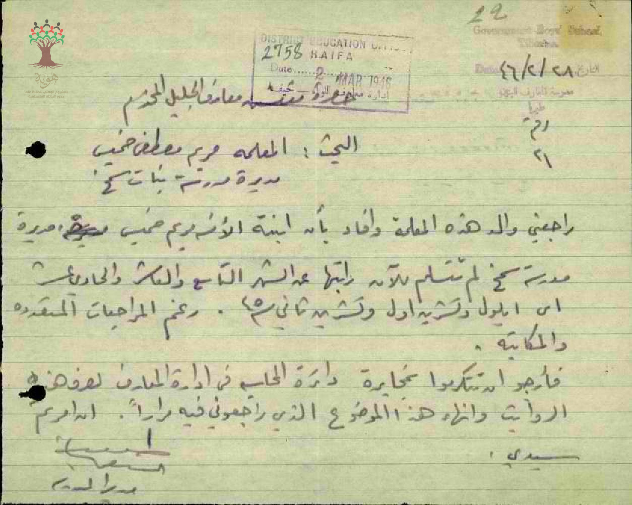 كتاب من مدير المدرس الى مفتش معارف الجليل بسبب راتب المعلمة مريم مصطفى خميس