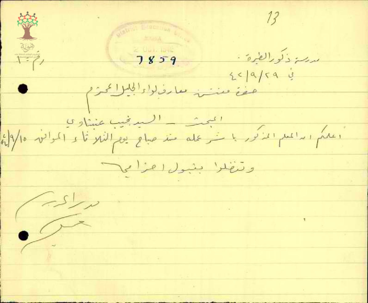 رسالة من مدير المدرسة الى مفتش معارف الجليل اعلمكم ان المعلم نجيب عنبتاوي باشر عمله منذ صباح يوم الثلاثاء