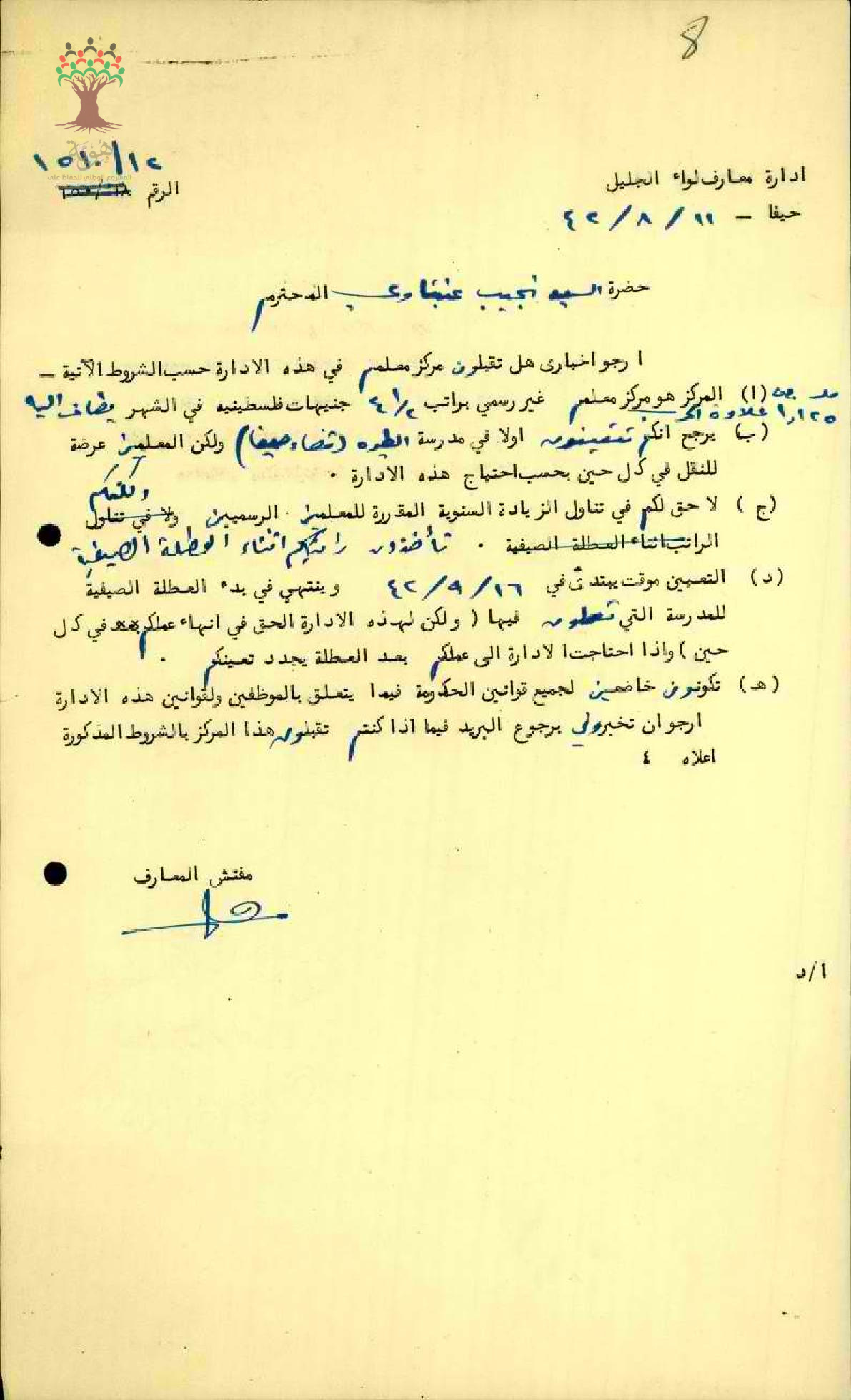 رسالة من مفتش معارف الجليل الى المعلم نجيب عنبتاوي ارجو اخباري هل تقبلون مركز معلم في هذه الادارة حسب الشرط الاتية