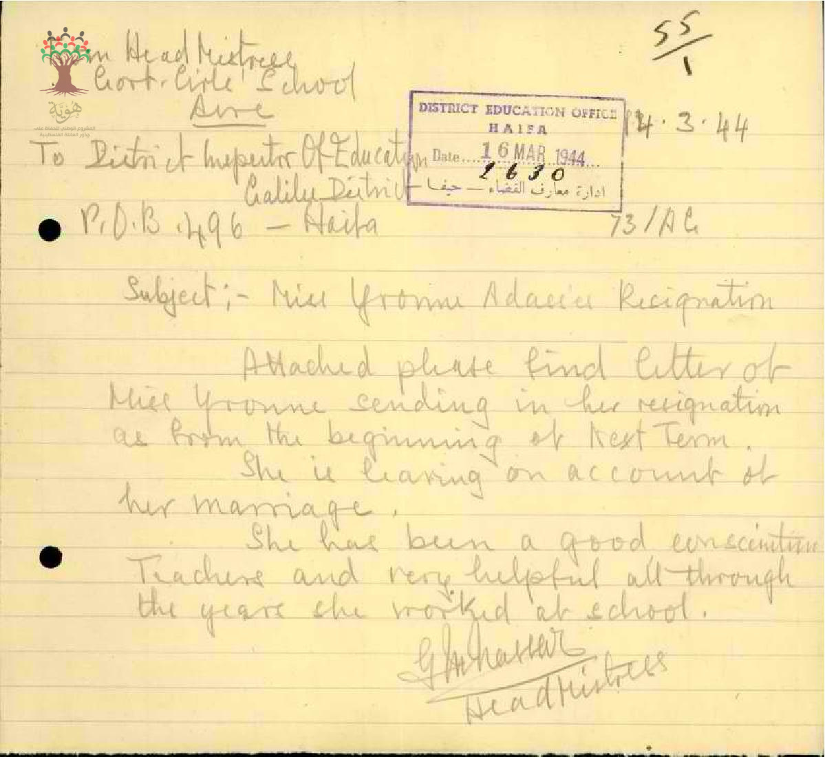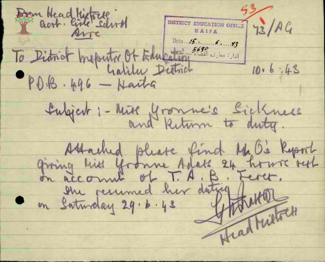 رسالة من مدير مدرسة عكا إلى مفتش المعارف يعلمه بغياب المعلمة ايفون عدس بسبب المرض