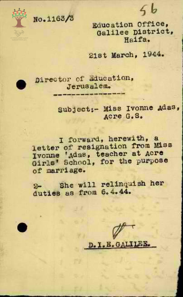 رسالة من مفتش المعارف إلى مدير المعارف يخبره باستقالة المعلمة ايفون عدس بسبب الزواج