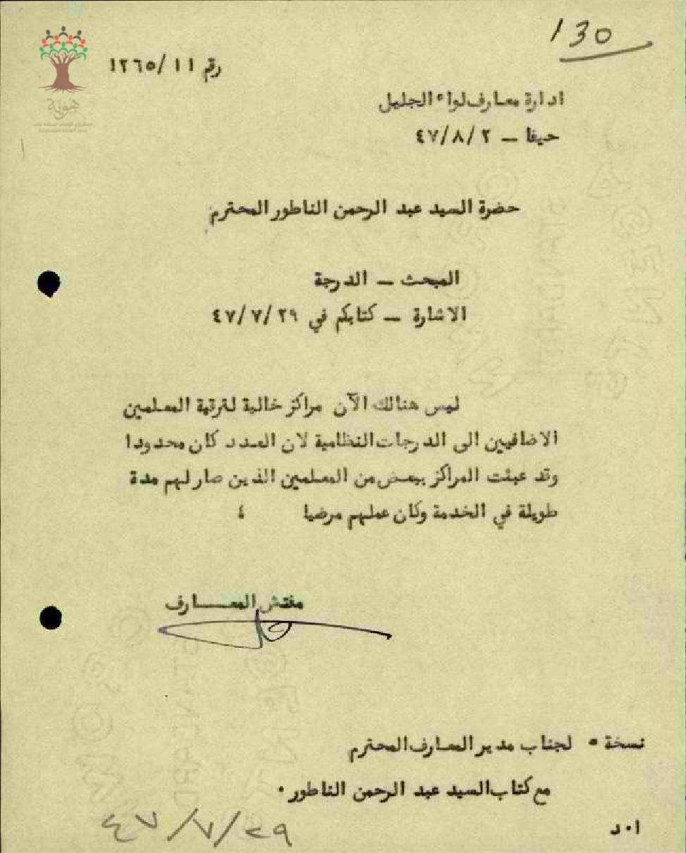 رد مفتش المعارف بشأن رسالة المعلم عبد الرحمن فرج الناطور لترقيته الى الدرجات النظامية