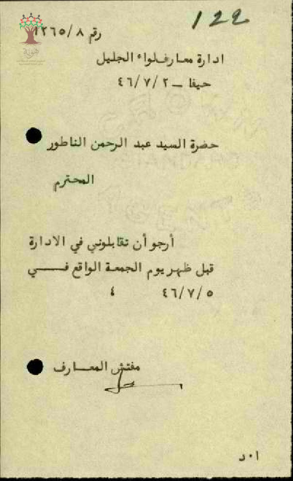 طلب مقابلة المعلم عبد الرحمن الناطور من قبل مفتش المعارف