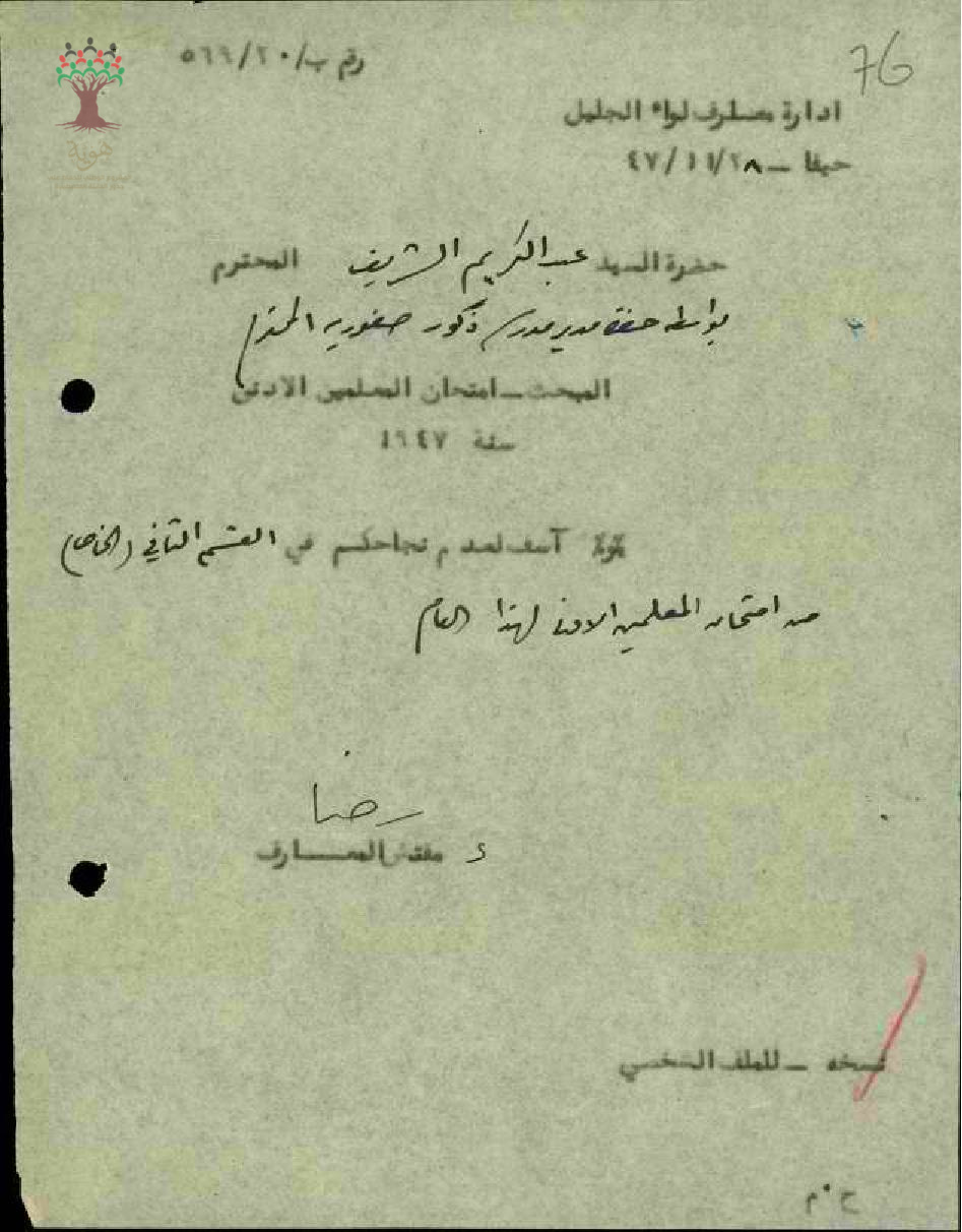 رسالة من مفتش المعارف الى المعلم عبد الكريم محمد الشريف اسف على عدم نجاحكم في القسم الثاني الخاص من امتحان المعليمن