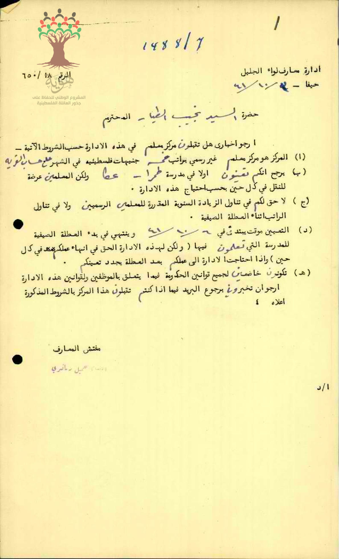 قرار تعيين نجيب الطيار - شعب معلما في مدرسة طمرة - عكا