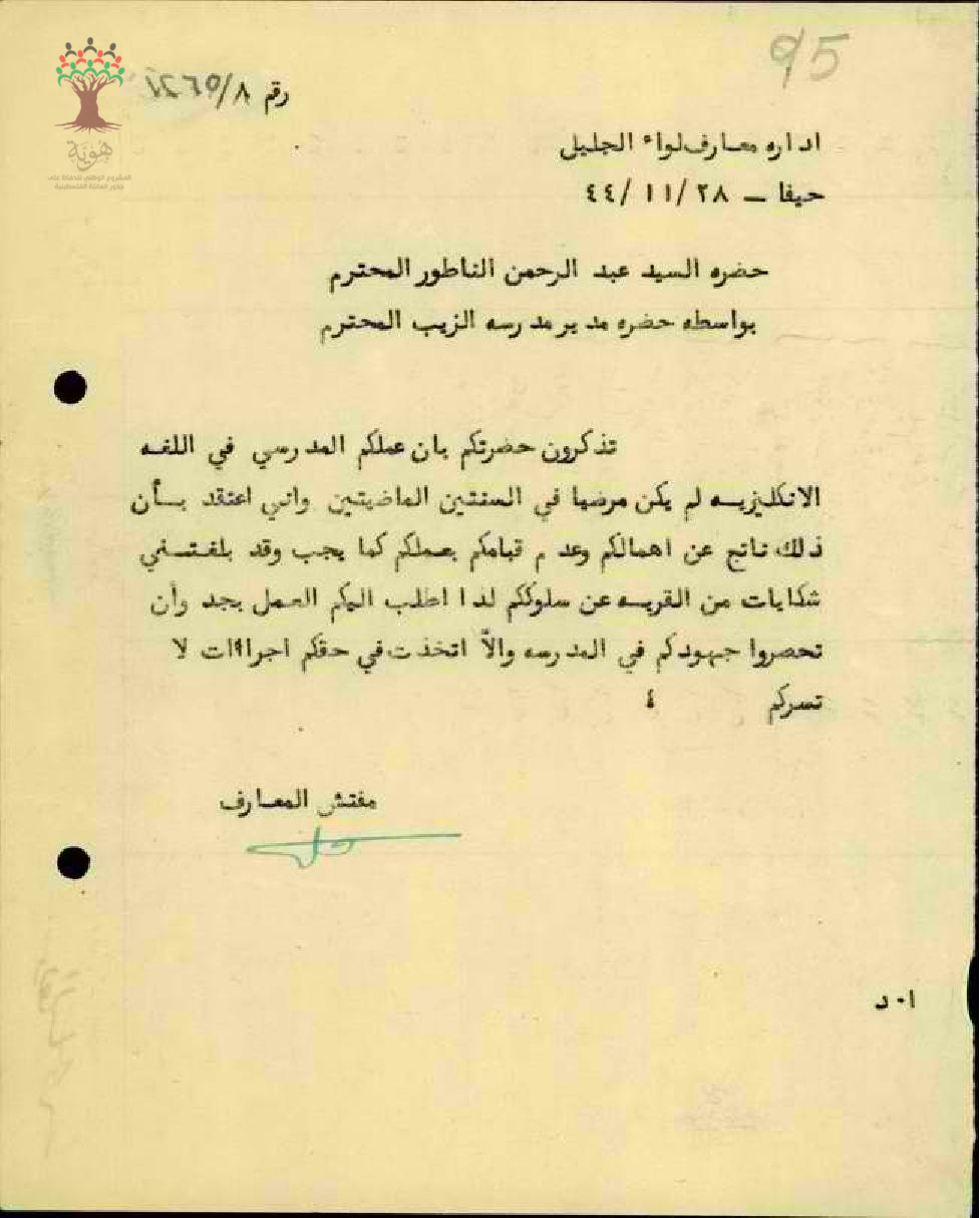 خطاب مفتش المعارف عن حالة الضعف في صفوف اللغة الانجليزية للطلاب في مدرسة الزيب موجه للمعلم عبد الرحمن فرج الناطور ويتضمن انذار باجراءات قاسية في حال استمر التقصير والاهمال