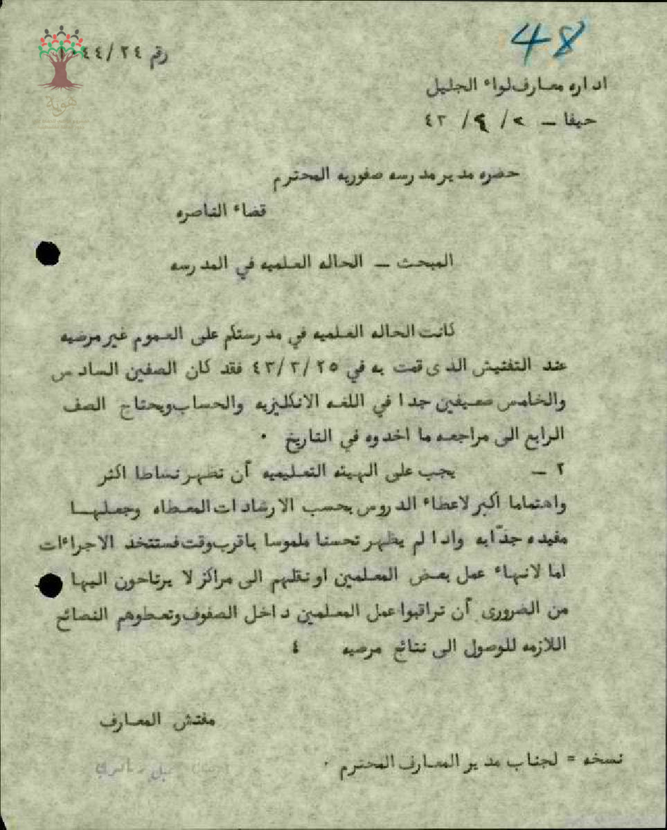 كتابة من مفتش المعارف الى مدير المعارف بسبب الحاله العلمية في المدرسة