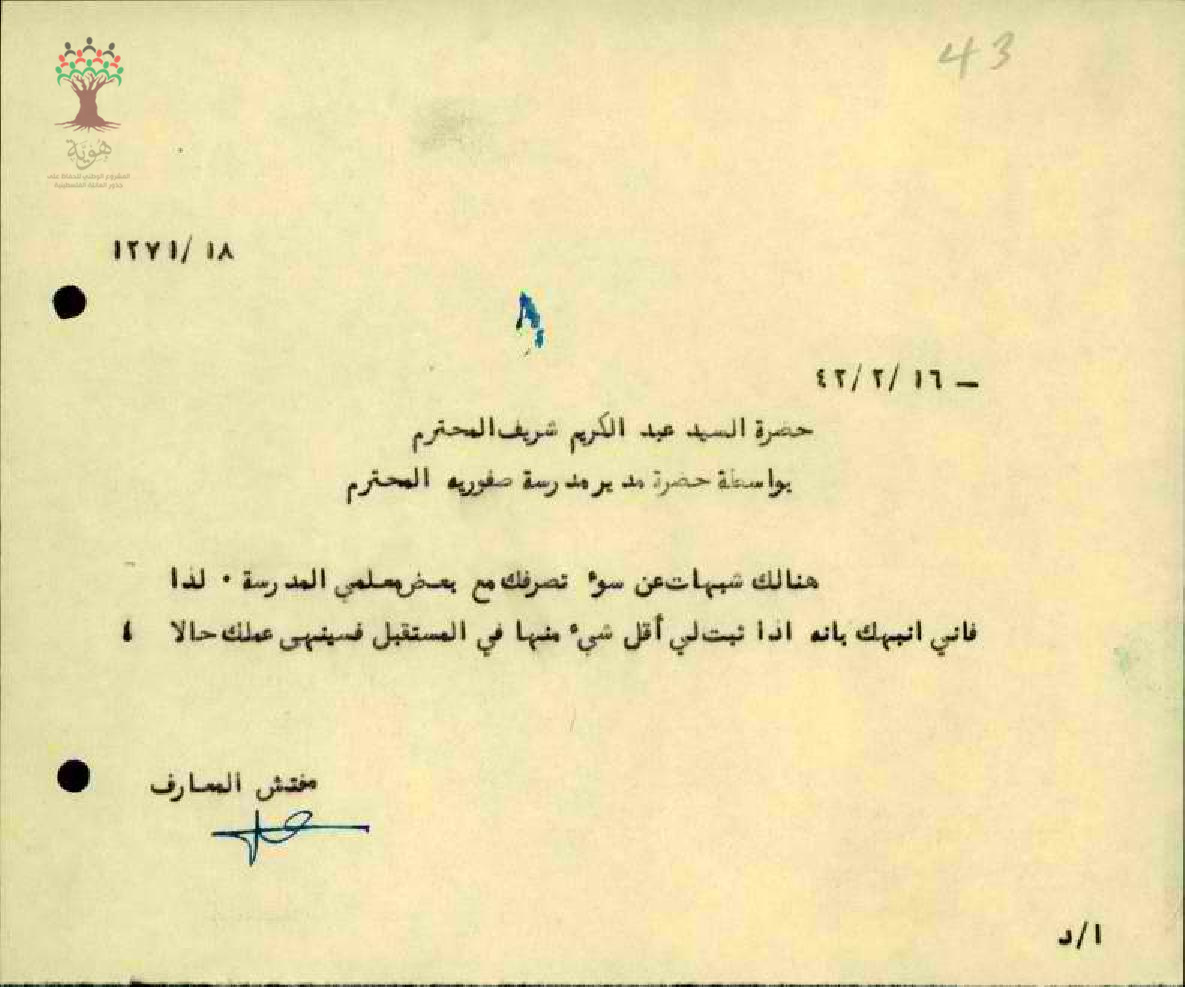 رسالة من مفتش المعارف الى المعلم عبد الكريم محمد الشريف هنالك شبهات عن سوء تصرفك مع بعض معلمي المدرسة