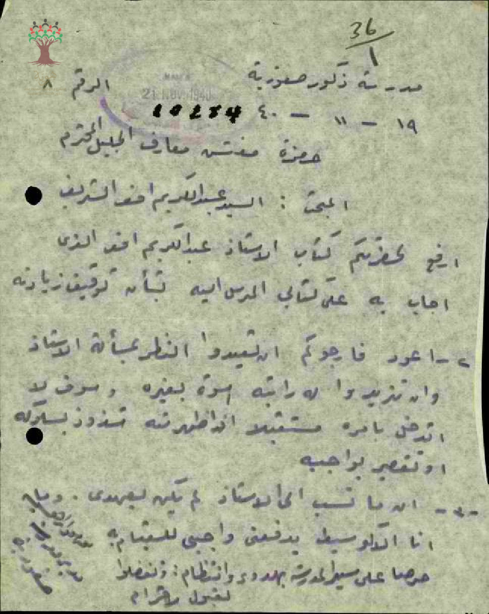 كتاب من مدير المدرس الى مفتش معارف الجليل بسبب توقف زيادة راتب المعلم عبد الكريم الشريف