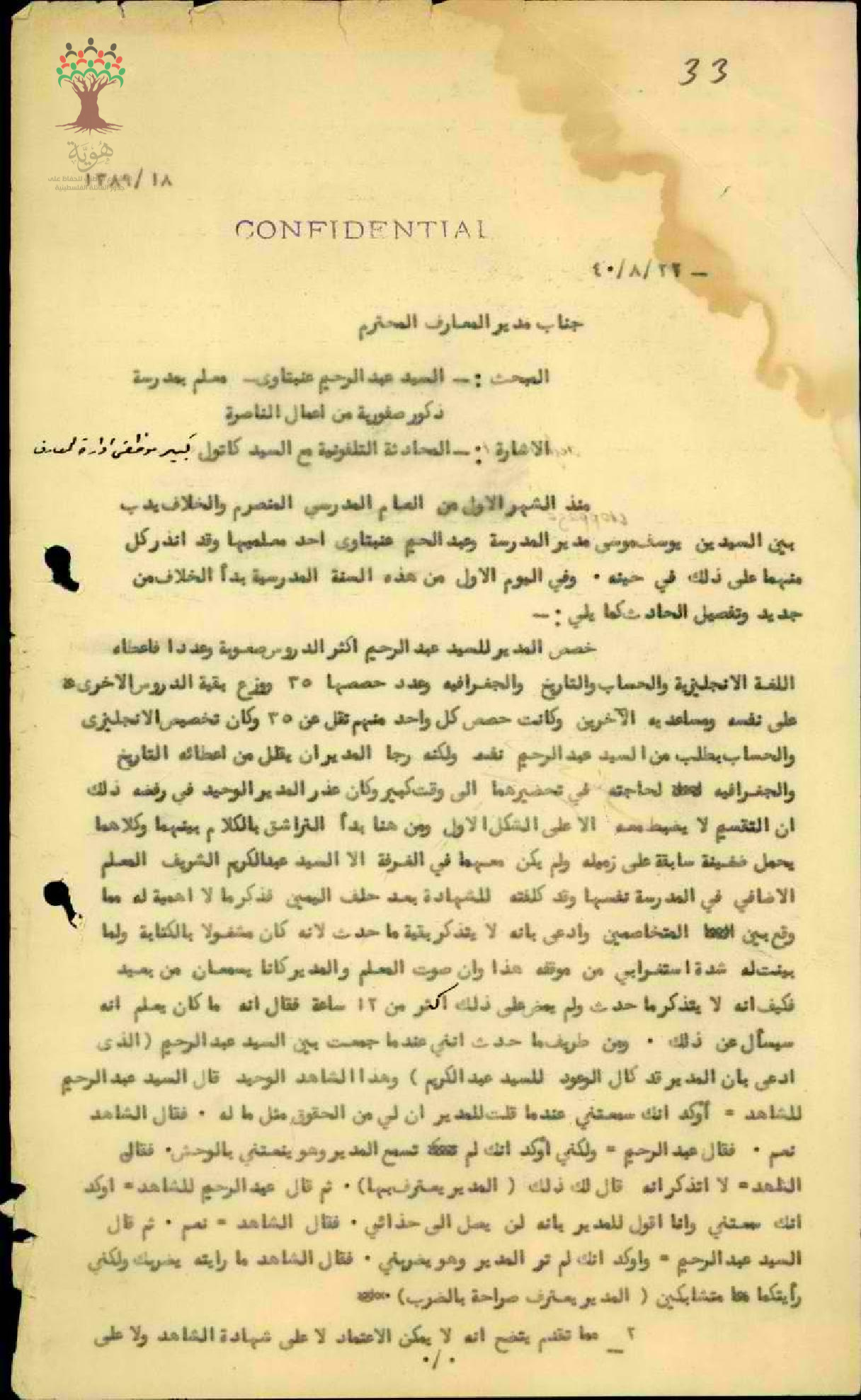 تقرير عن الخلاف الذي دب بين مدير المدرسة يوسف موسى وعبد الرحيم عنيتاوي وهو أحد معلميها من أول السنة الدراسية