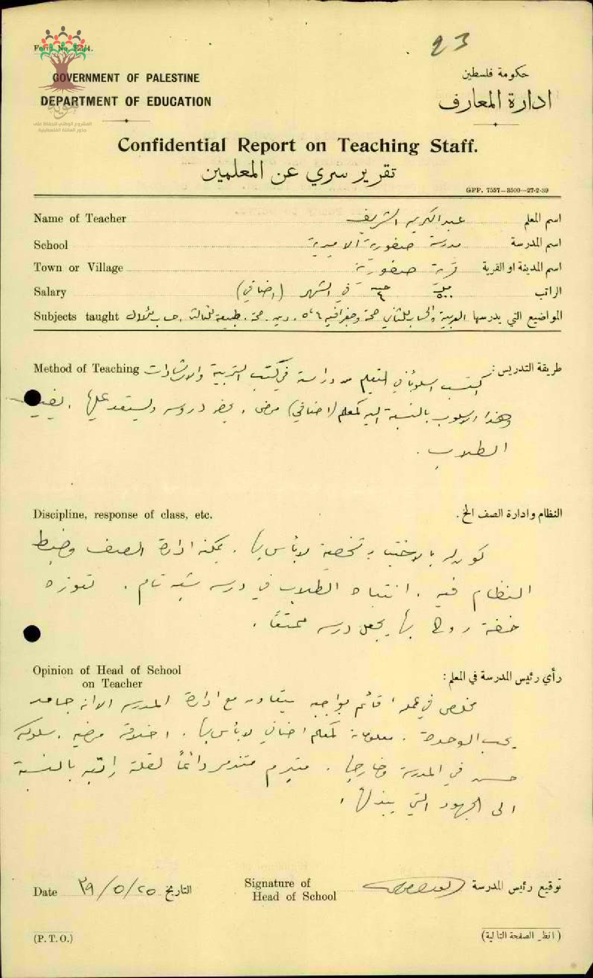 تقريرتفصيلي حول اداء المعلم عبد الكريم محمد الشريف في مدرسة صفورية الاميرية