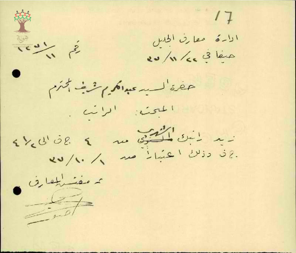 رسالة من مفتش المعارف الى المعلم عبد الكريم محمد الشريف تقرير زيادة راتبك السنوي