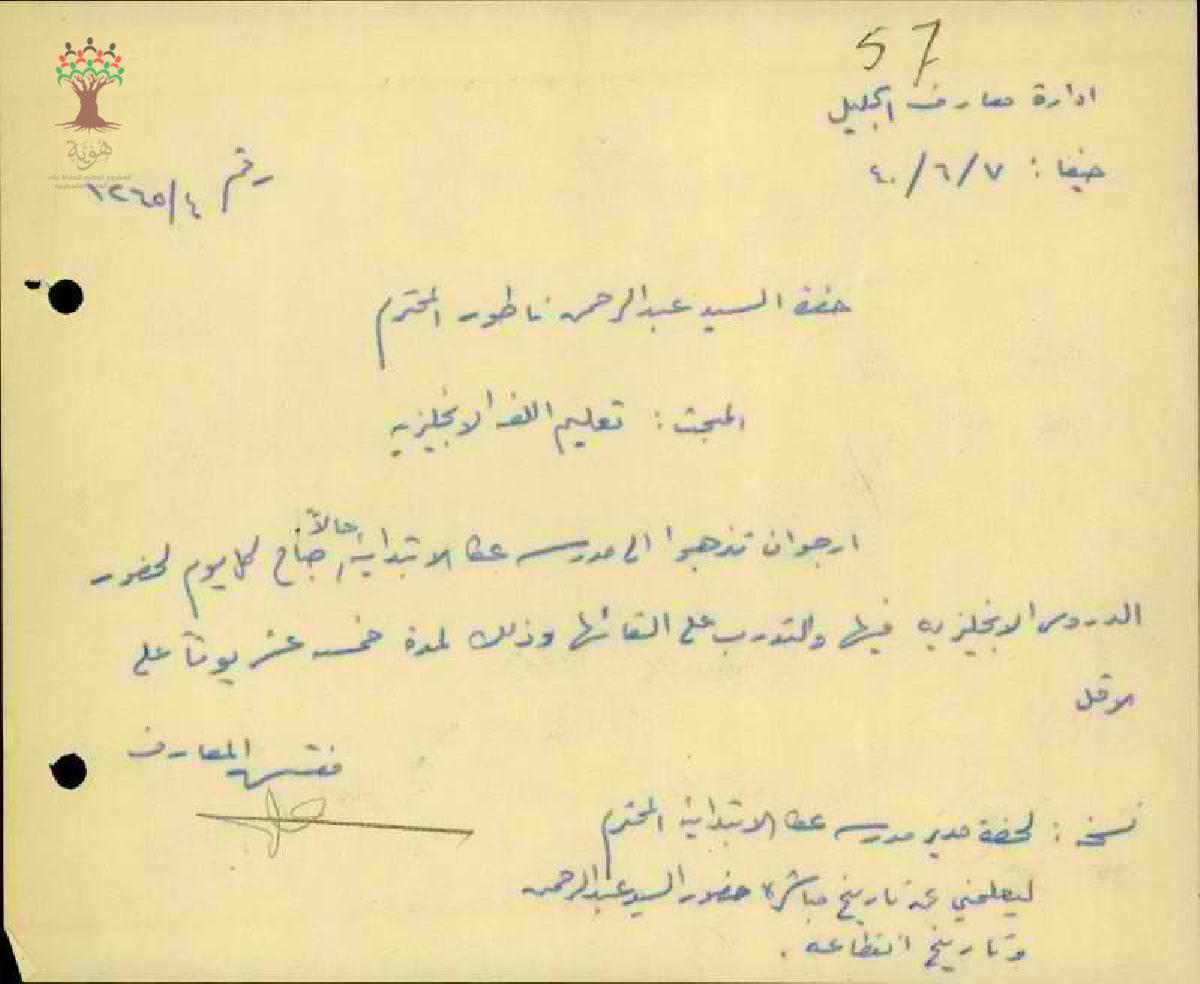 طلب مفتش المعارف من المعلم عبد الرحمن فرج الناطور الذهاب الى مدرسة عكا الابتدائية لتعلم دروس اللغة الانجليزية