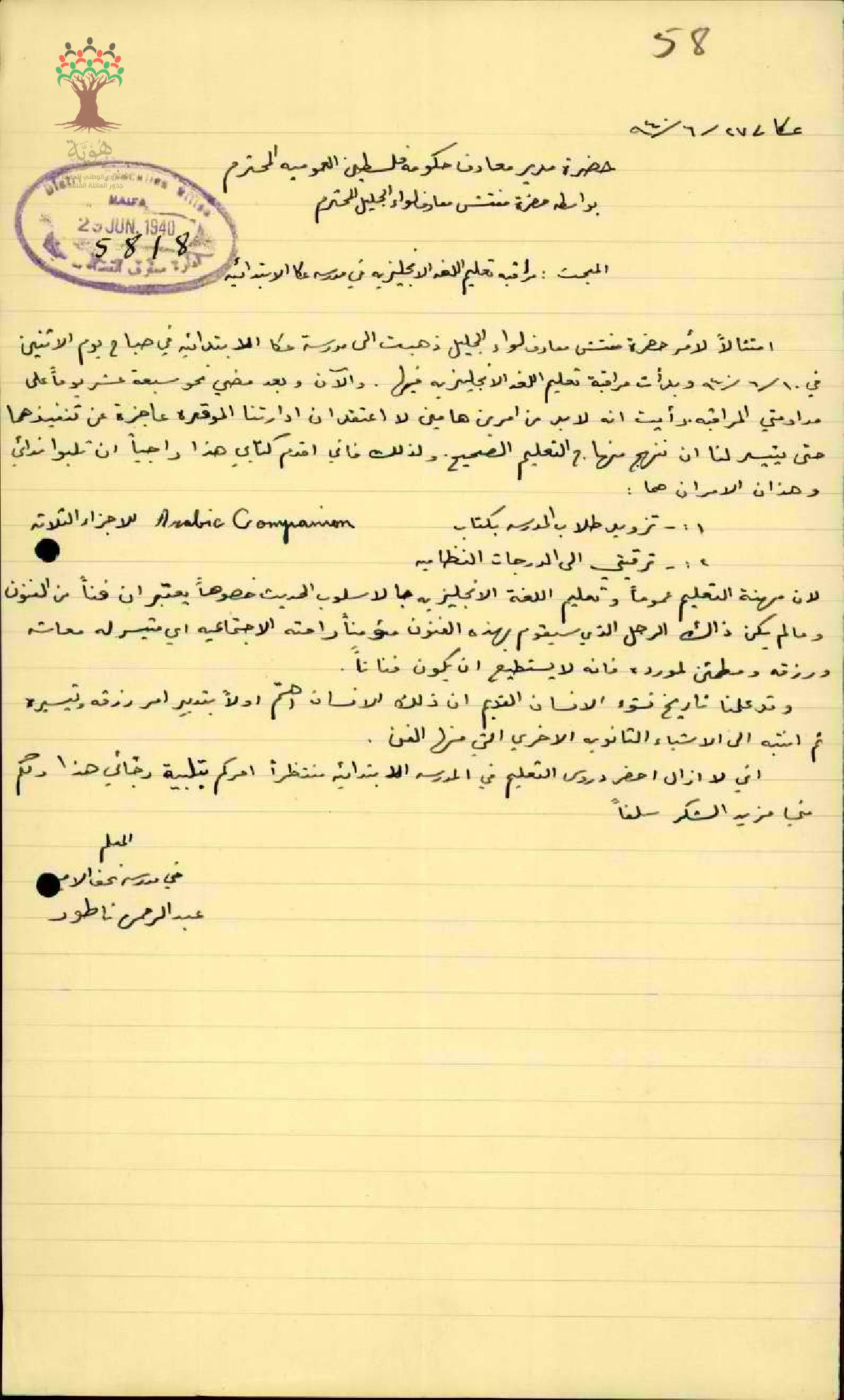 مراقبة طرائق تعليم اللغة الانجليزية في مدرسة عكا الابتدائية من قبل المعلم عبد فرج الناطور بعد طلب مفتش المعارف له بذلك