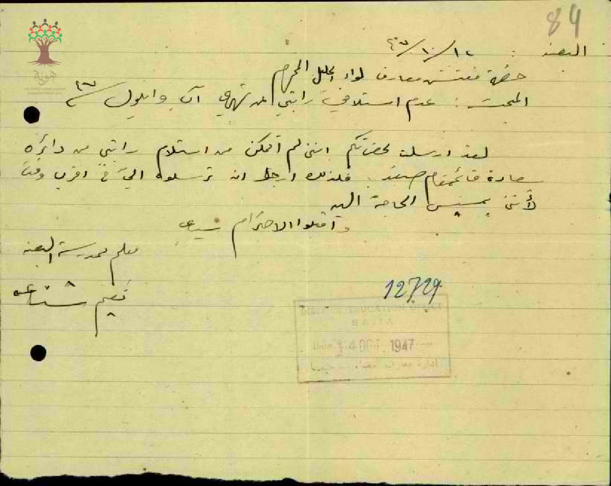 رسالة من المعلم نعيم يوسف شناعة الى مفتش المعارف لقد ارسلت لحضرتكم انني لم اتمكن من استلام راتبي من دائرة سعادة قائم المقام صفد