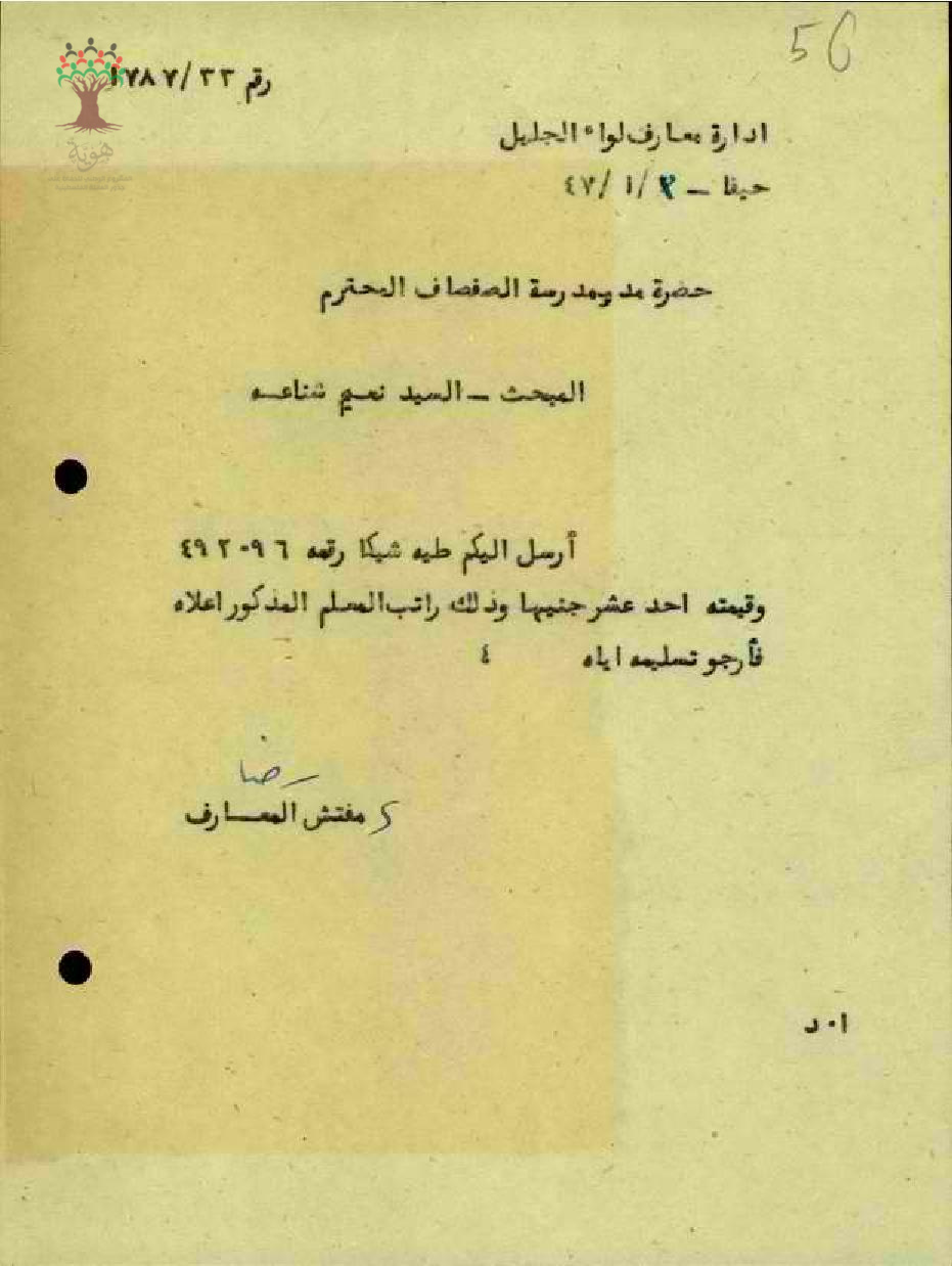 كتاب من مفتش المعارف الى مدير مدرسة الصفصاف بسبب تسليم راتب المعلم نعيم شناعة