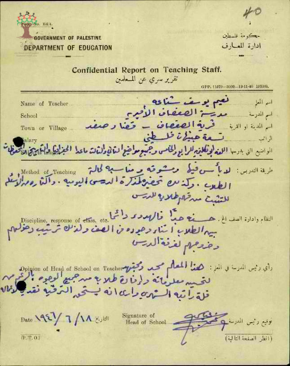 تقرير تفصيلي حول اداء المعلم نعيم يوسف شناعة في مدرسة الصفصاف