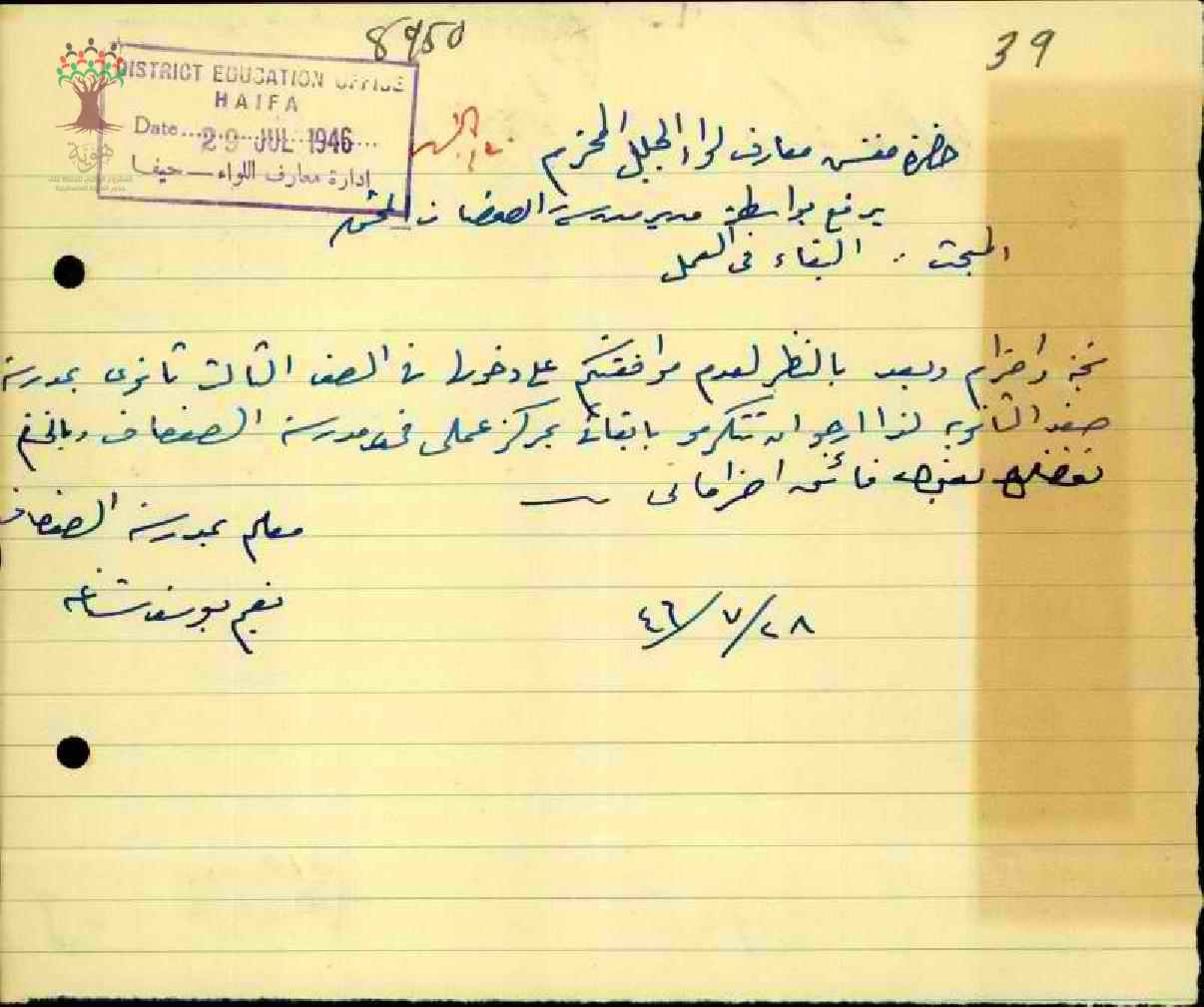 رسالة من المعلم نعيم شناعة الى مفتش معارف الجليل ارجو ان تتكرمو بابقائي بمركز عملي في مدرسة الصفصاف