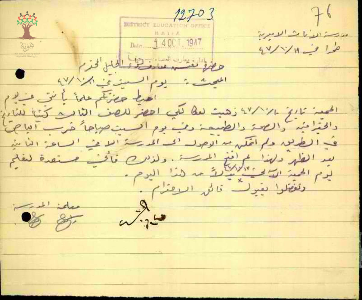 تبرير التأخير عن الحضور للمدرسة من قبل المعلمة رابعة عبد الحميد طه من مدرسة طمرا حيث انها ذهبت لاحضار بعض الكتب المدرسية في مواد الجغرافية ووالتاريخ والصحة والطبيعة