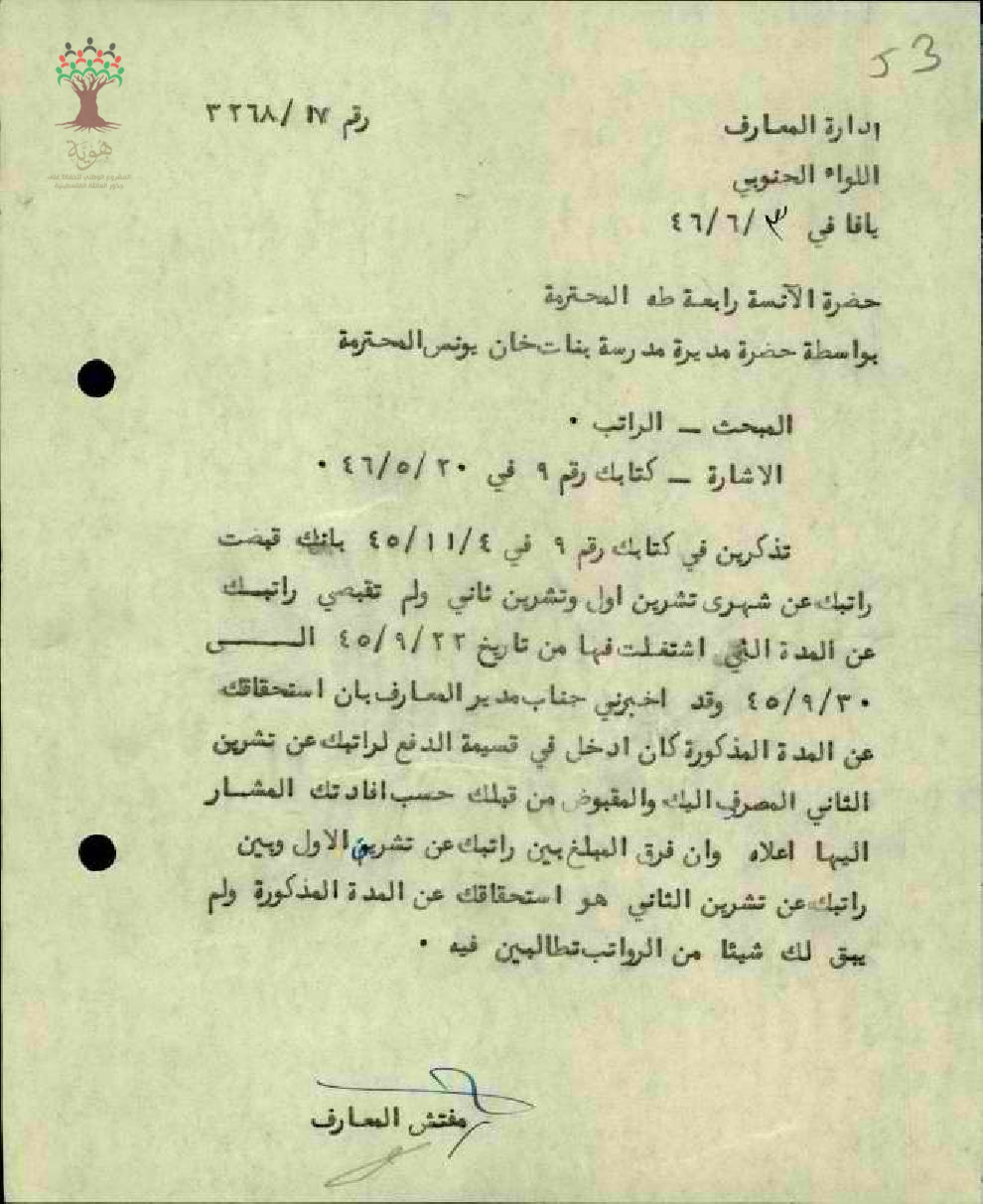 توضيح للمعلمة رابعة عبد الحميد طه بخصوص الراتب وانه لم يعد لها اي مستحقات تطالب بها