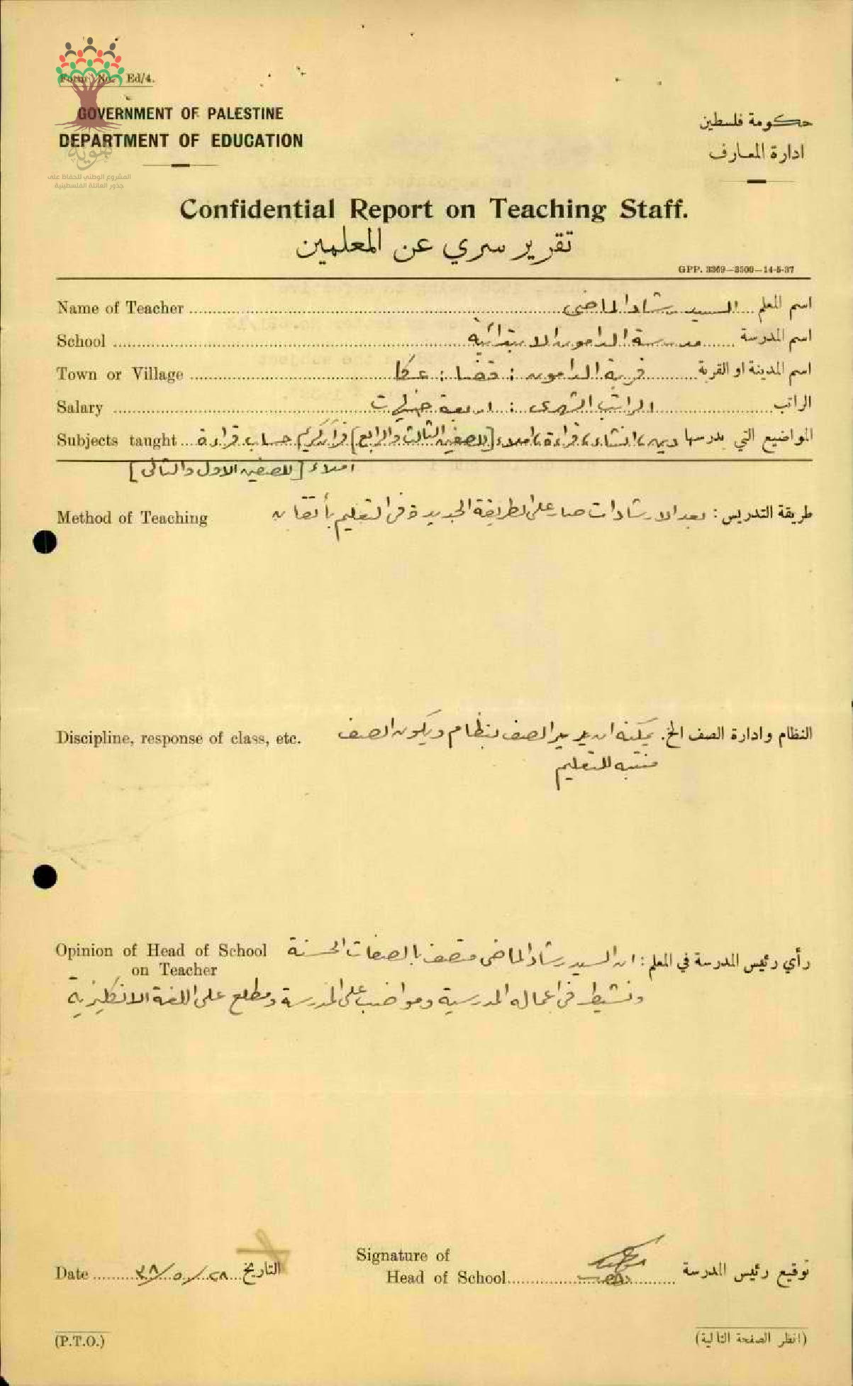 تقرير تفصيلي حول اداء المعلم رشاد ماضي في مدرسة الدامون