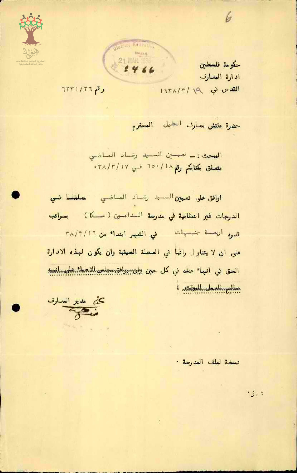 رسالة من مدير المعارف الى مفتش المعارف اوافق على تعيين المعلم رشاد ماضي معلما في الدرجات غير النظامية في مدرسة الدامون عكا