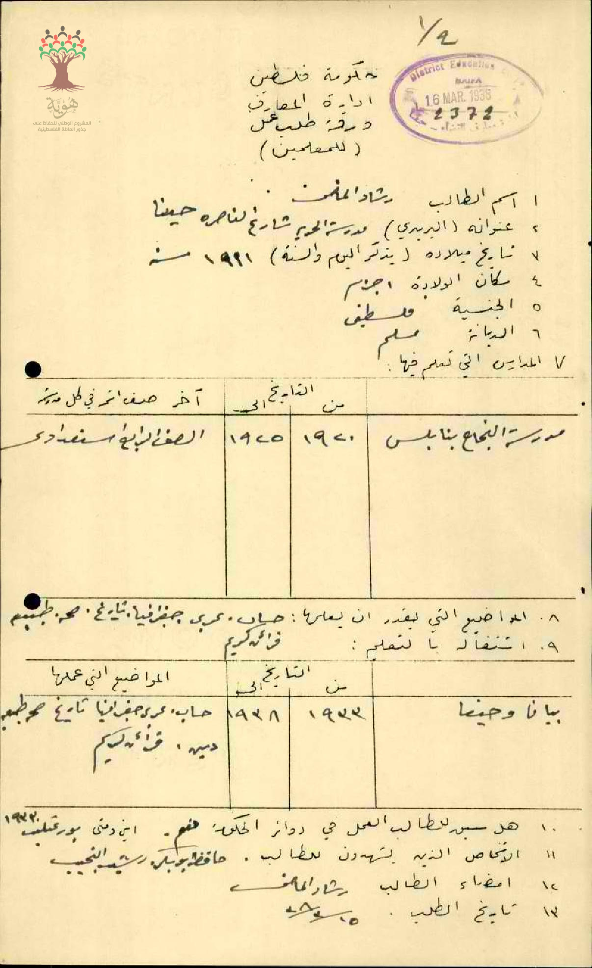 حكومة فلسطين ادارة المعارف ورقة طلب عمل للمعلم رشاد ماضي في مدرسة الحرية شارع الناصره حيفا