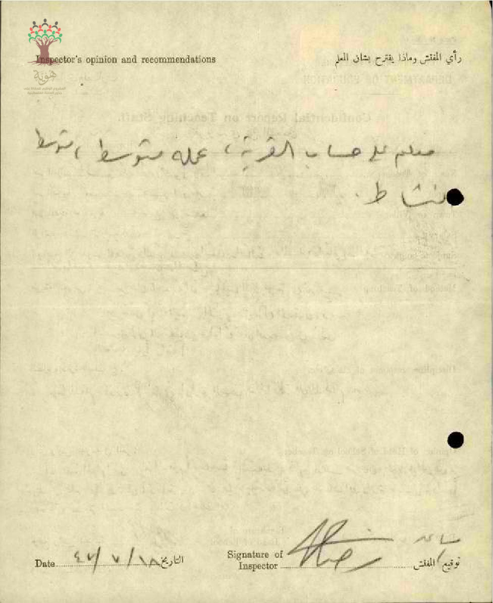 راي مفتش المعارف بالمعلم مصطفى عرابي _معلم على حساب القرية عمله متوسط متوسط النشاط