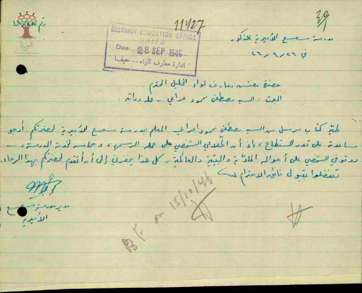طية كتاب مرسل من المعلم مصطفى عرابي الى مفتش المعارف
