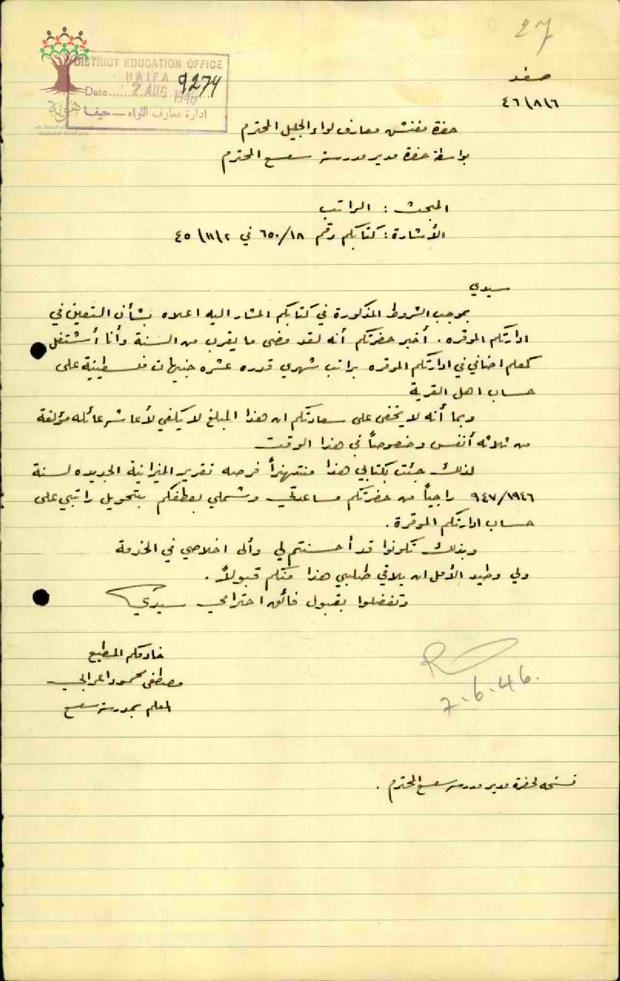 كتاب من المعلم مصطفى عرابي الى مفتش المعارف بخصوص الراتب