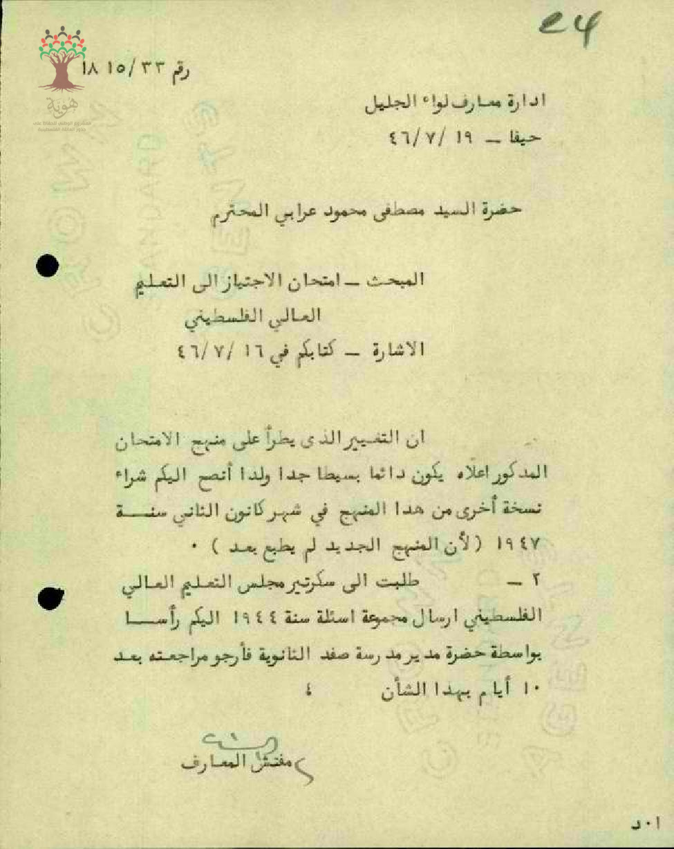 رسالة من مفتش المعارف الى المعلم مصطفى عرابي بخصوص امتحان الاجتياز الى التعليم العالي