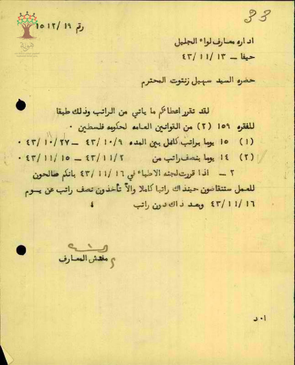 قرار اعطاء راتب المعلم سهيل زنتوت وفقا لقوانين حكومة فلسطين