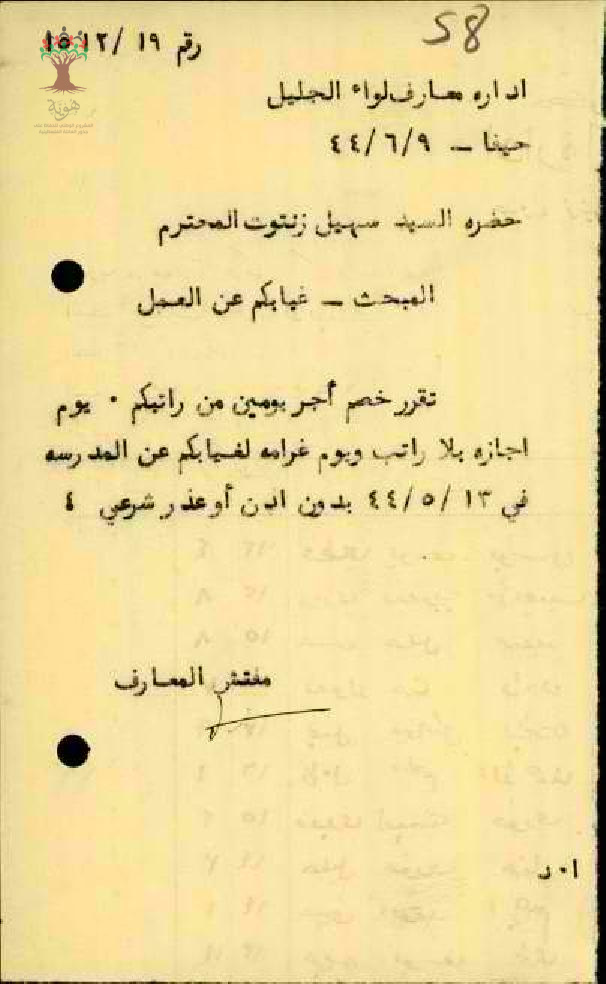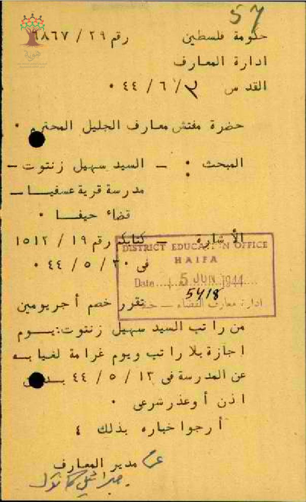 قرار حسم يومين من راتب المعلم سهيل زنتوت من مدرسة عسفيا كالتالي يوم اجازة بلا راتب وآخر كغرامة بسبب غيابه عن المدرسة