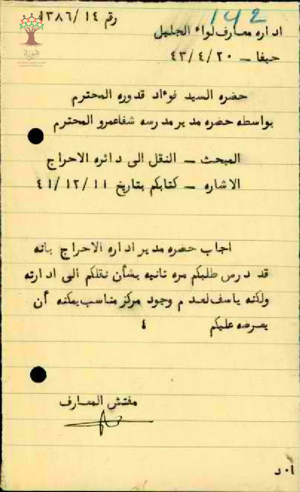 رسالة من مفتش المعارف الى المعلم فؤاد قدورة بخصوص النقل الى دائره الاحراج
