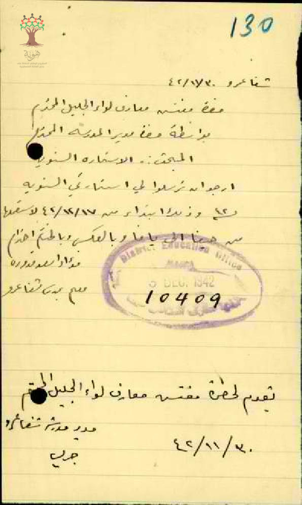 رسالة من المعلم فؤاد قدورة الى مفتش المعارف بخصوص ارسل الاستمارة السنويه