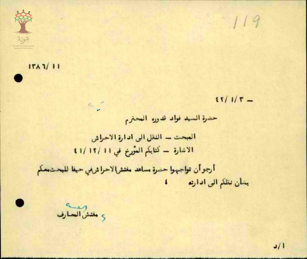 رسالة من مفتش المعارف الى المعلم فؤاد قدورة بخصوص النقل الى ادارة الاحراش
