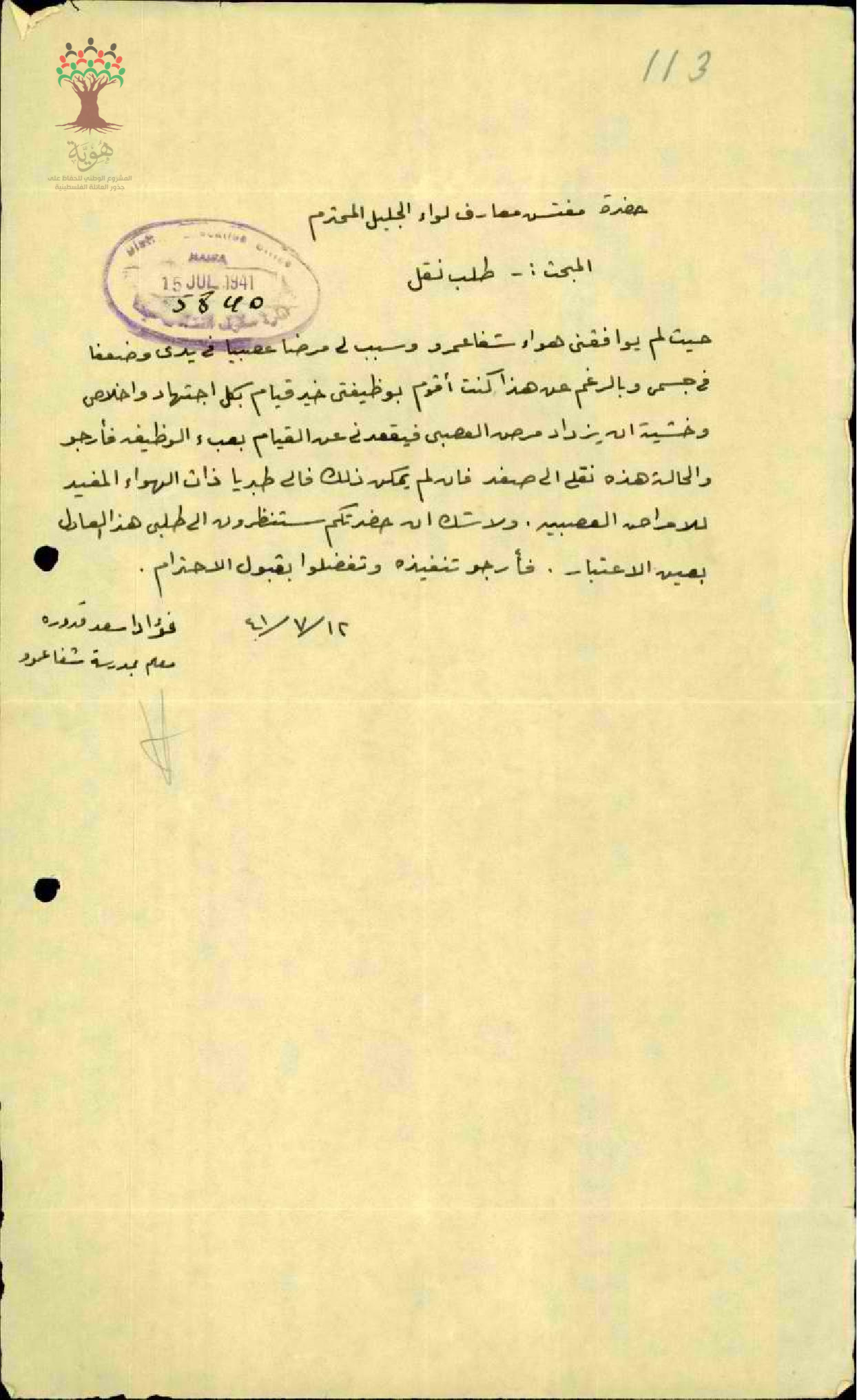 رسالة من المعلم فؤاد قدورة الى مفتش المعارف بخصوص طلب نقل من مدرسة شفا عمرو الى صفد