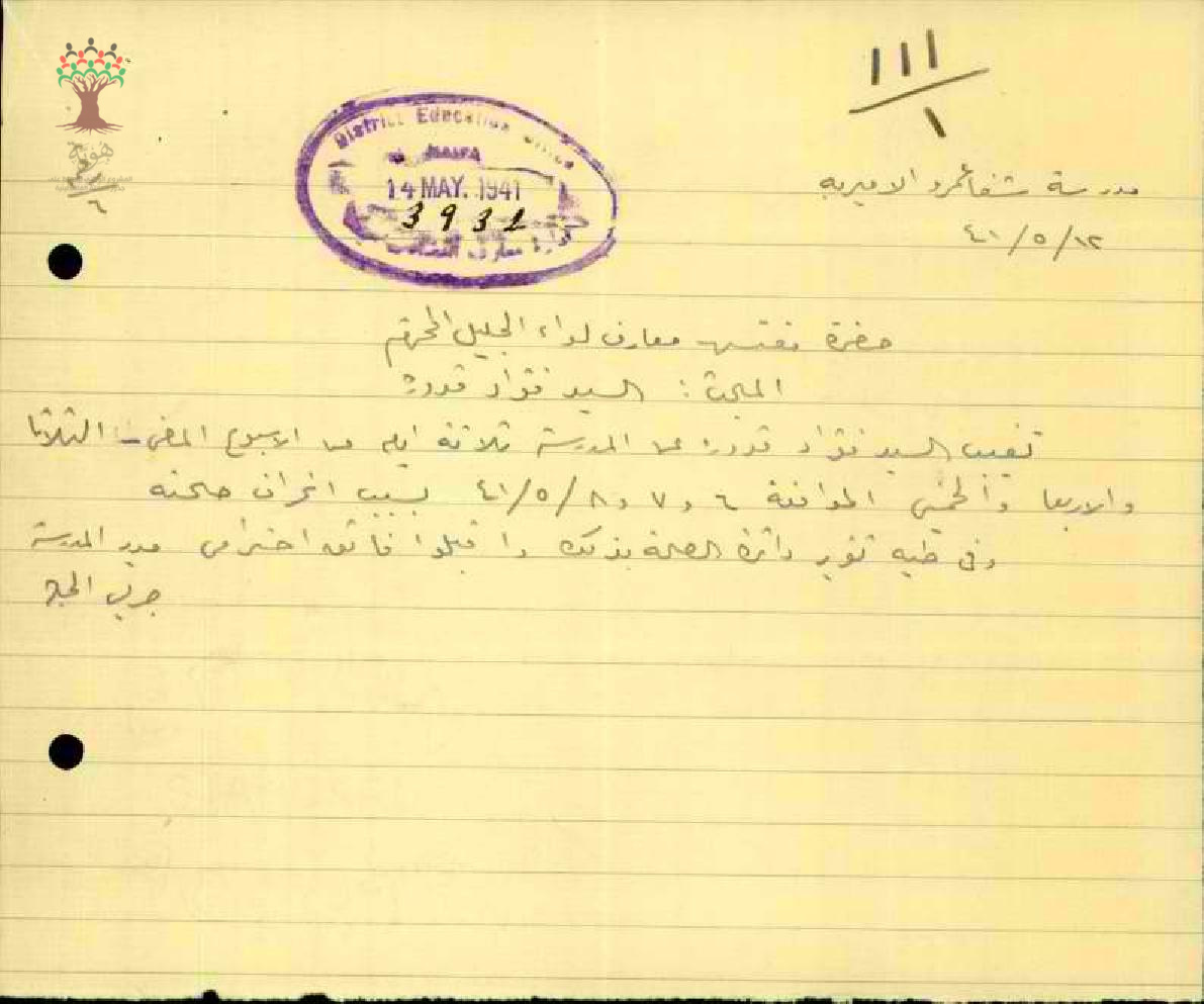 رسالة من مدير المدرسة الى مفتش المعارف بخصوص غياب المعلم فؤاد قدورة عن المدرسة