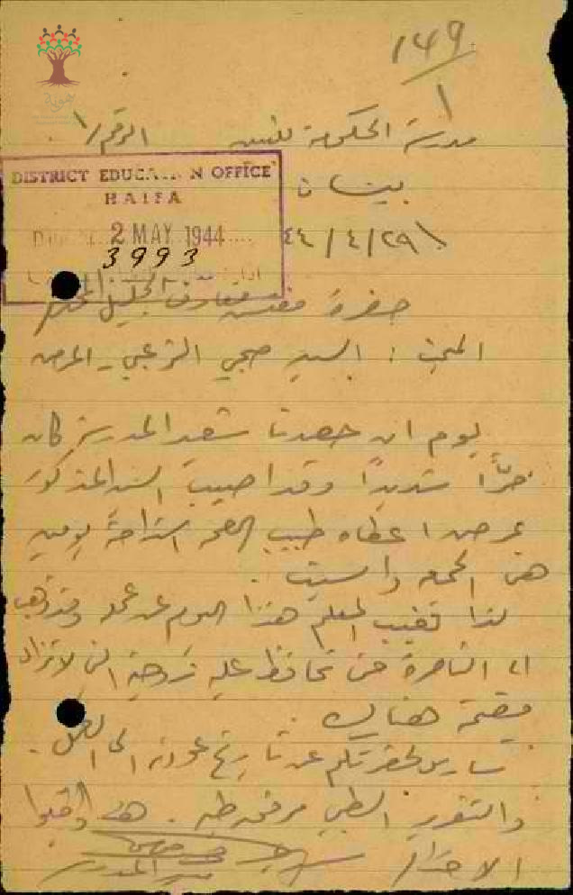 رسالة من مدير مدرسة بيسان الى مفتش المعارف بخصوص تغيب المعلم صبحي الزعبي مرفقة بالتقرير الطبي