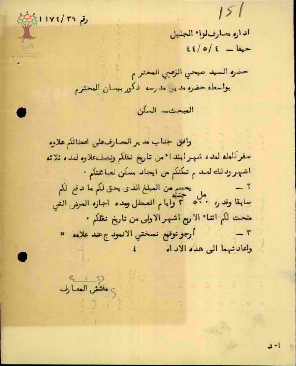 رسالة من مفتش المعارف الى المعلم صبحي الزعبي بخصوص دفع تكاليف تنقله