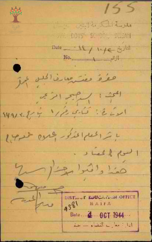 رسالة من مدير مدرسة بيسان الى مفتش المعارف بخصوص عودة المعلم صبحي الزعبي الى العمل