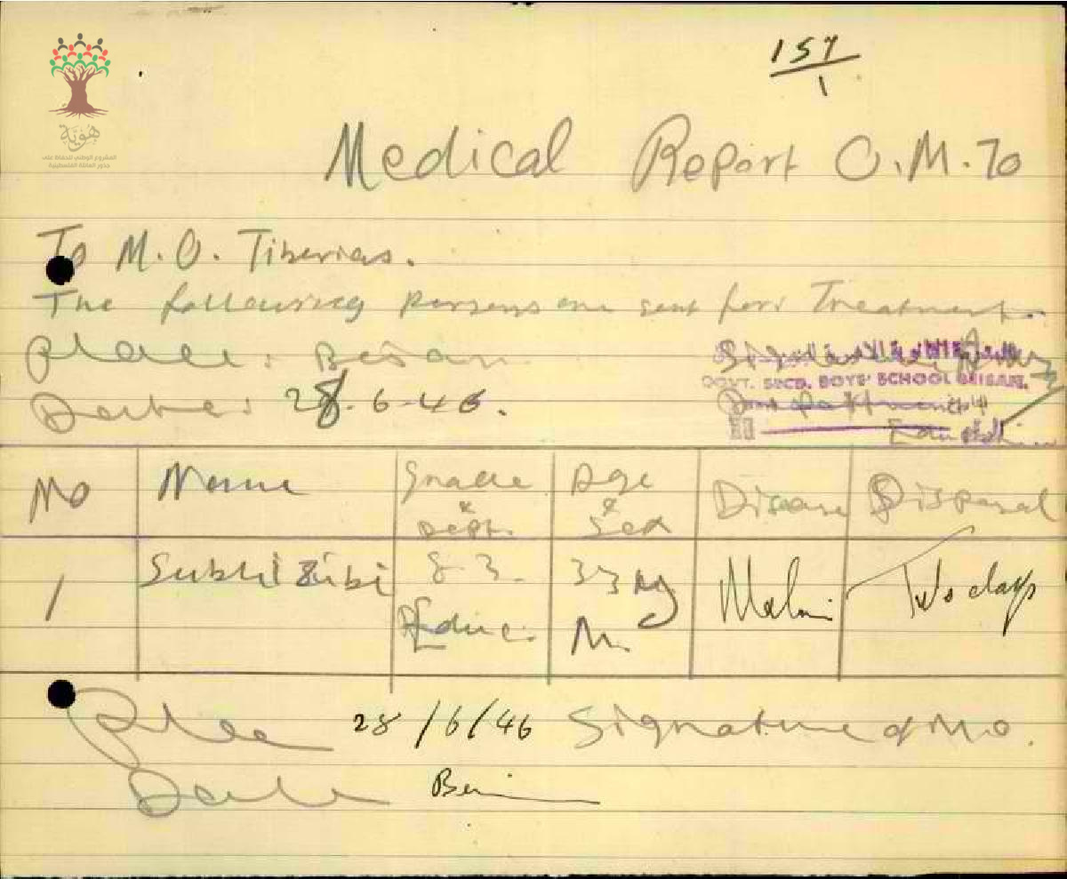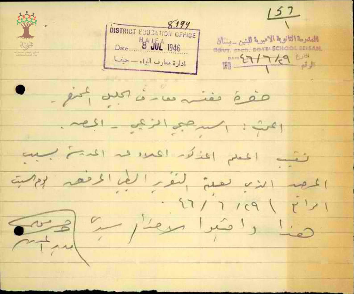 رسالة من مدير مدرسة بيسان الى مفتش المعارف بخصوص تغيب المعلم صبحي الزعبي مرفقة بالتقرير الطبي